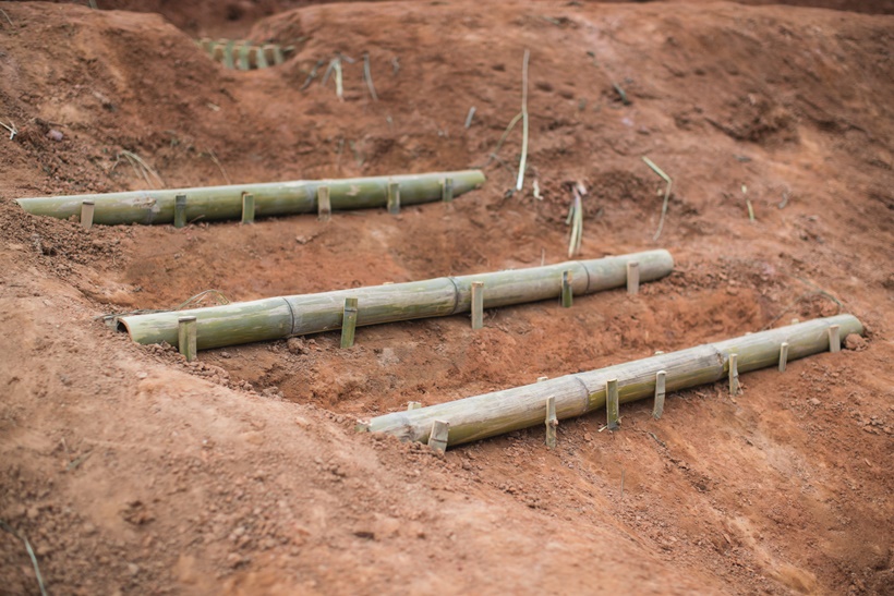 นอกจากนี้ให้ขุดหลุมเล็ก ๆ เพื่อให้น้ําที่ไหลมาตกในหลุม เป็นการชะลอน้ําที่ไหลผ่านไม่ให้ไหลแรงเกินไป รวมถึงการทําฝายเล็ก ๆ เป็นระยะ ๆ เพื่อชะลอน้ํา ทําให้น้ําซึมลงใต้ดินได้มากที่สุด และยังเป็นการล็อกตะกอนดินที่เกิดจากการทับถมกันของใบไม้และอินทรียวัตถุต่าง ๆ ซึ่งอุดมด้วยธาตุอาหารที่จําเป็นแก่พืช