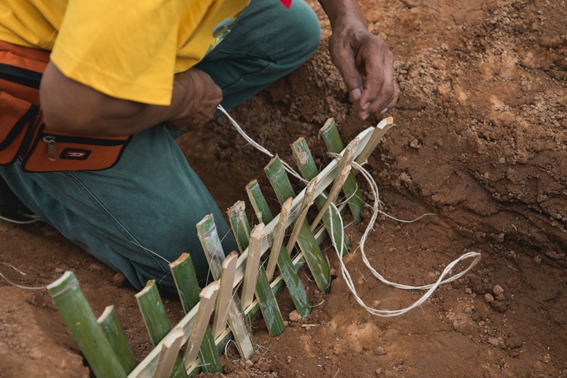 ให้ขุดเป็นร่องโดยมีความกว้างและความลึก 50 เซนติเมตร โดยนําดินที่ได้จากการขุดขึ้นมาถมในฝั่งตรงข้ามของแหล่งน้ําที่ไหลมา ทําคันดินให้กว้าง 1 เมตร แล้วปลูกแฝกเพื่อลดการพังทลายของคันดินปลูกไม้ผล และผักสวนครัวไว้เป็นแหล่งอาหาร