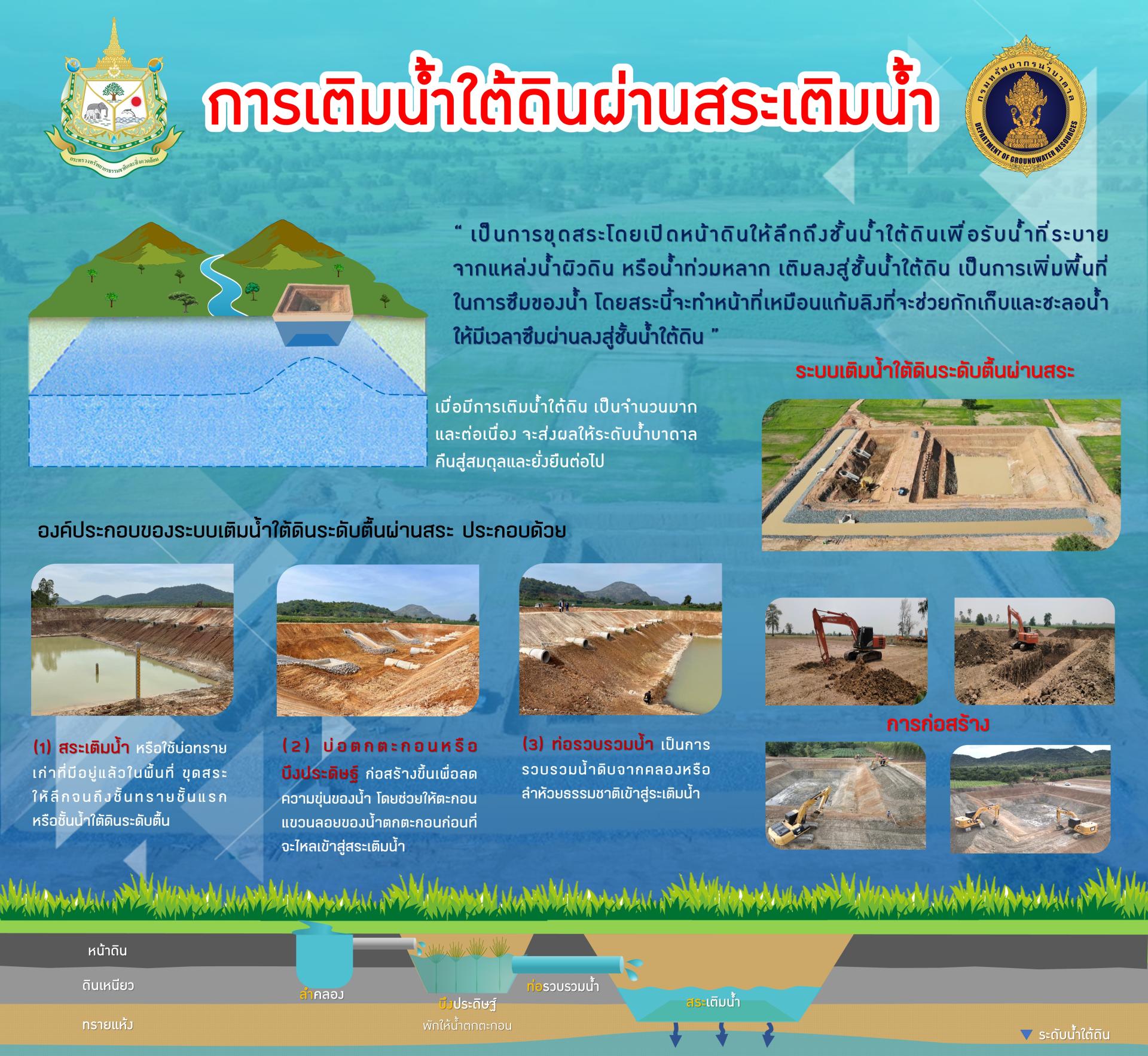 - องค์ประกอบของระบบเติมน้ำผ่านสระ ประกอบด้วย 1) สระเติมน้ำ ทั้งนี้ ขนาดของสระเติมน้ำขึ้นอยู่กับความเหมาะสมของสภาพพื้นที่ หรือใช้บ่อทรายเก่าที่มีอยู่แล้วในพื้นที่ โดยความลึกของสระต้องไม่เกิน 15 เมตร 2) บ่อตกตะกอน และ 3) ท่อรวบรวมน้ำดิบเข้าสู่สระเติมน้ำ โดยกรมทรัพยากรน้ำบาดาลได้ดำเนินการออกแบบมาตรฐานการก่อสร้างเป็น 2 รูปแบบ ดังนี้
