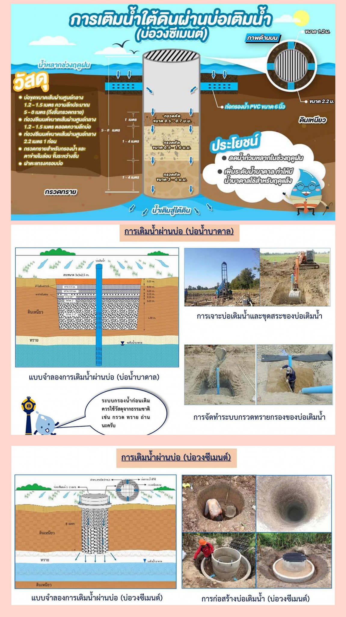 - วิธีการเติมน้ำผ่านบ่อเติมน้ำ จะจัดทำระบบกรองโดยบรรจุกรวดขนาดต่างๆ ระหว่างบ่อวงนอกและบ่อวงในด้านบนรอบๆ บ่อเติมน้ำ ดังนี้