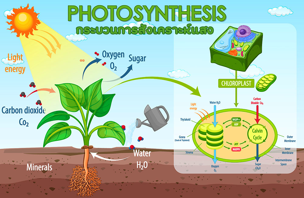 6CO₂ + 6H₂O + พลังงานแสง → C₆H₁₂O₆ + 6O₂