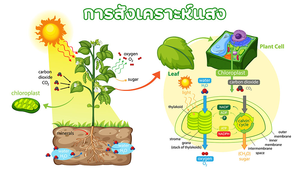 6CO₂ + 6H₂O + พลังงานแสง → C₆H₁₂O₆ + 6O₂