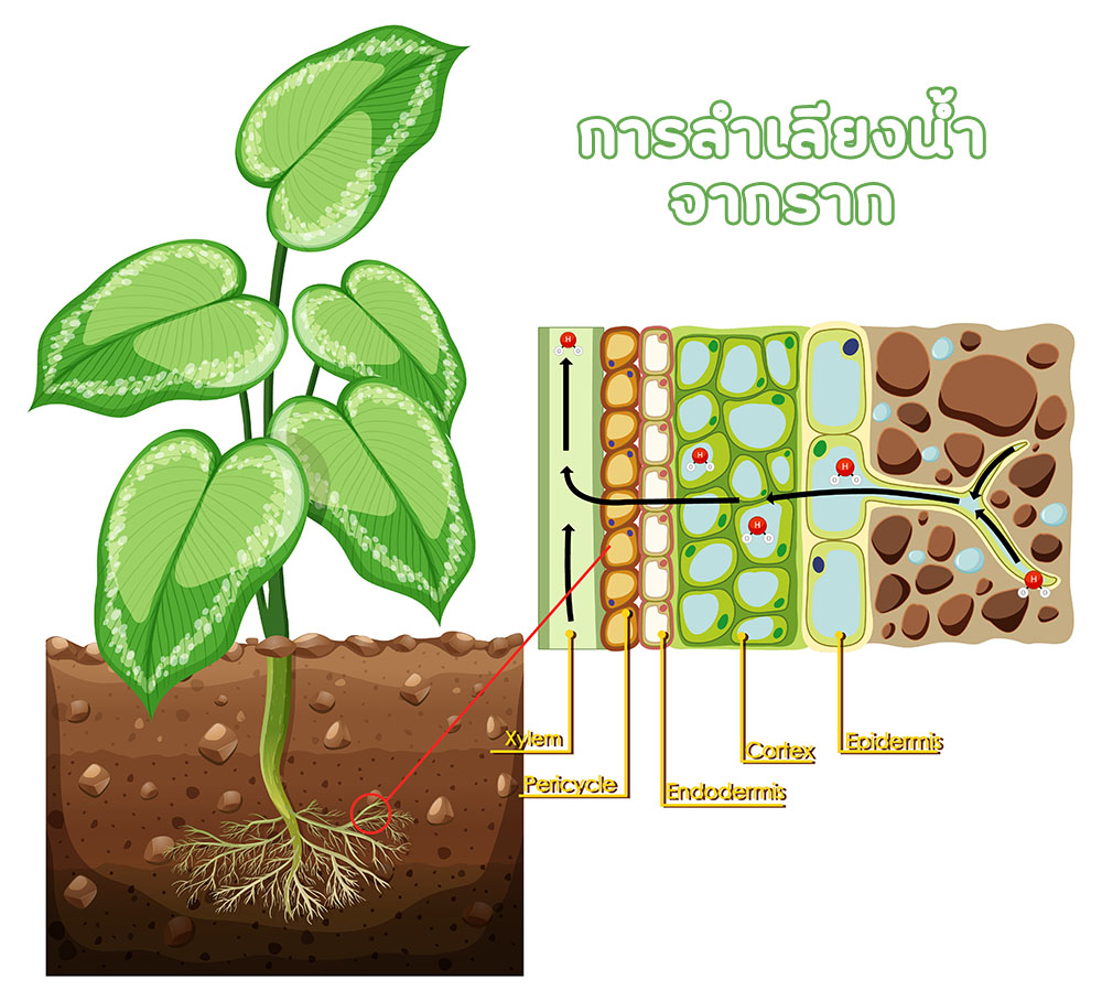 จากในดินมายังรากและเข้าสู่ต้นและส่วนต่างๆของพืช