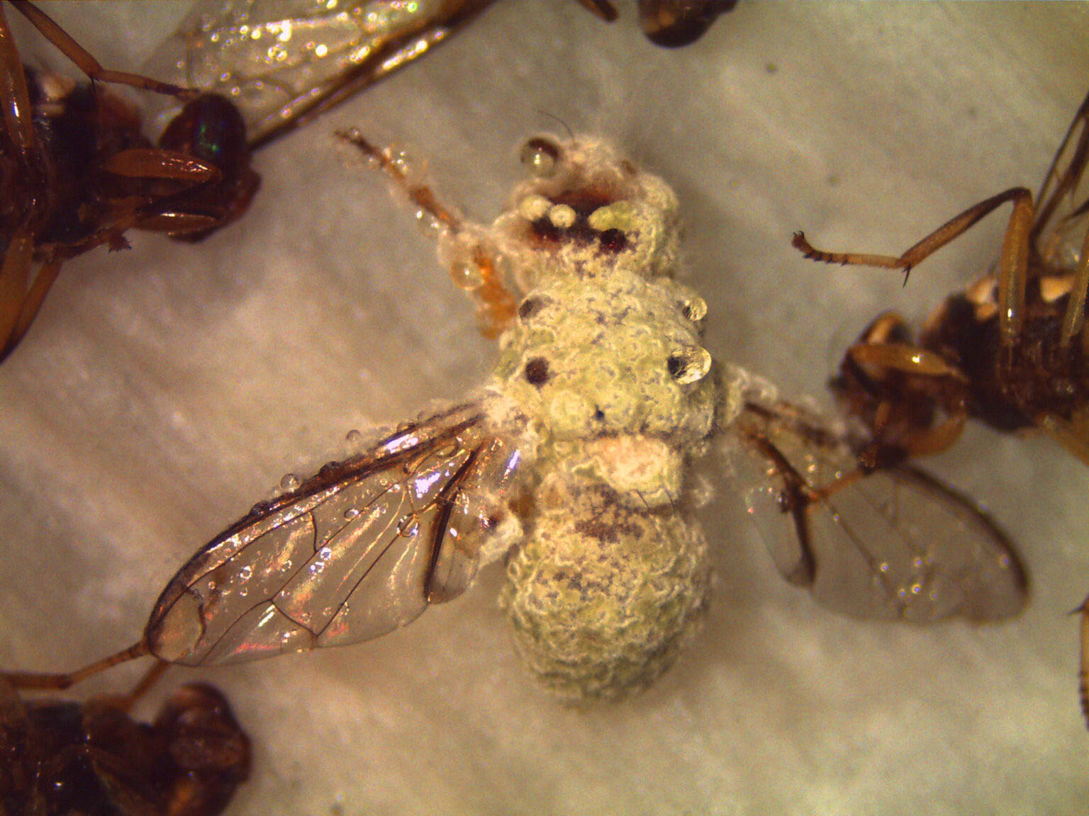 - เมื่อแมลงตาย เชื้อราจะเจริญเต็มที่และแทงเส้นใยออกมาภายนอกซากแมลง