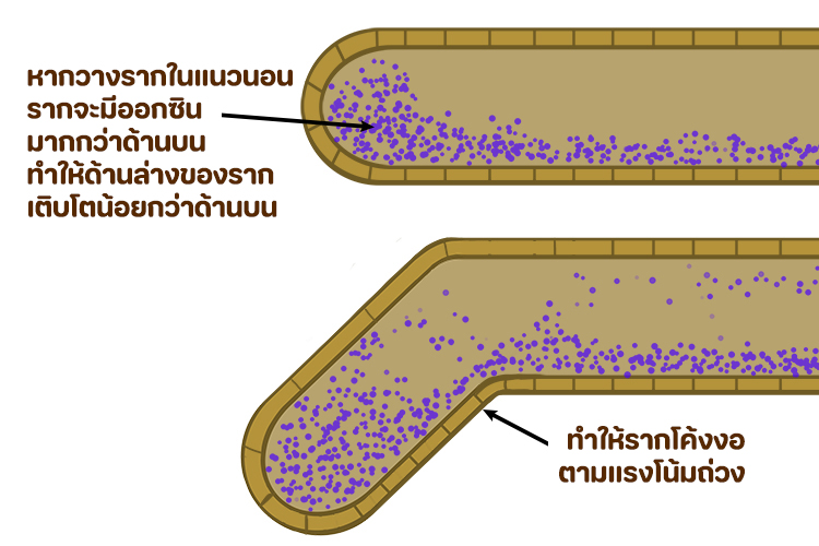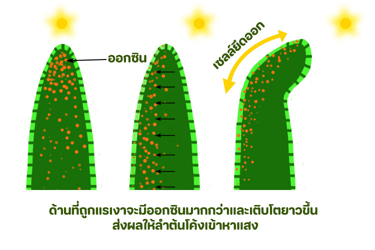 - การตอบสนองต่อแสง (Phototropism) และแรงโน้มถ่วง (Gravitropism): ออกซินเป็นตัวกลางสำคัญในการตอบสนองต่อสิ่งเร้าภายนอกเหล่านี้ โดยจะมีการเคลื่อนย้ายและกระจายตัวของออกซินที่ไม่เท่ากันในด้านที่ได้รับแสงหรือด้านล่าง ทำให้เกิดการโค้งงอของลำต้นเข้าหาแสง และการเจริญเติบโตของรากตามแรงโน้มถ่วง