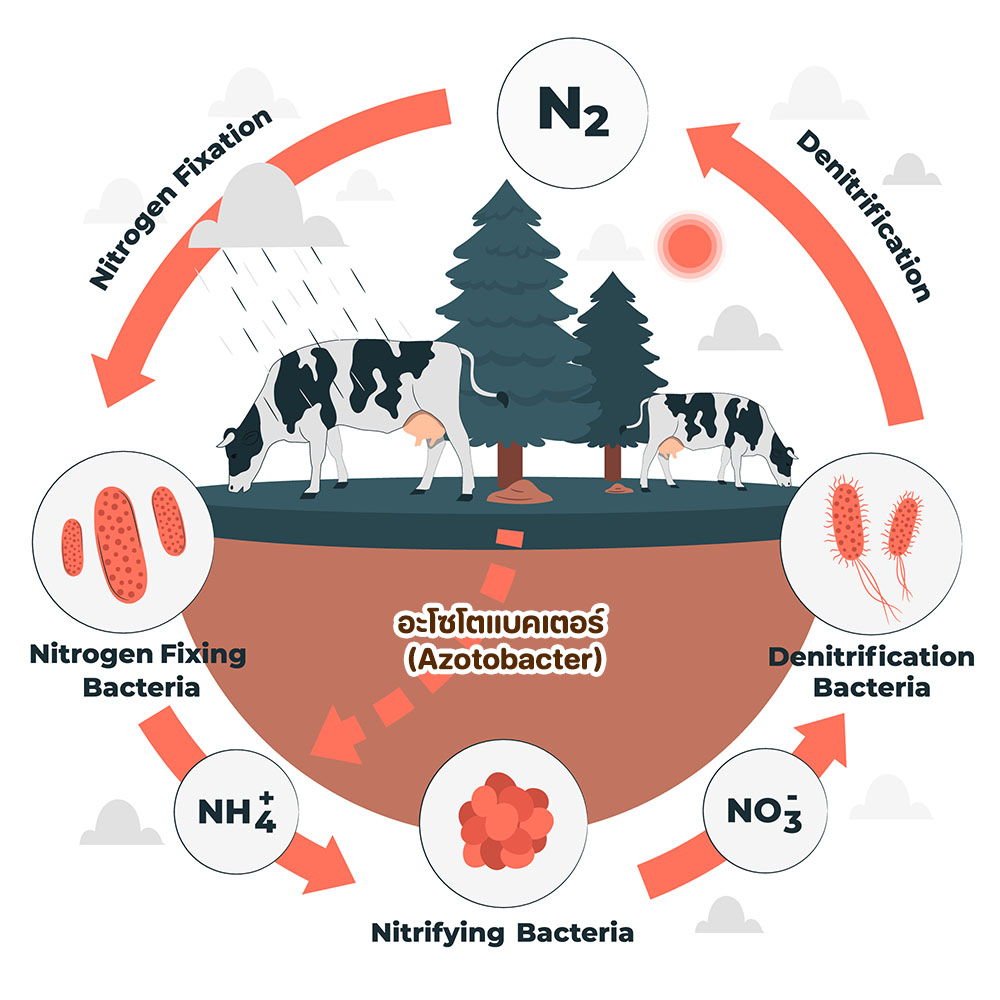 - การตรึงไนโตรเจนจากบรรยากาศ: Azotobacter มีความสามารถในการเปลี่ยนก๊าซไนโตรเจน (N₂) ในอากาศให้เป็นแอมโมเนีย (NH₃) ซึ่งเป็นรูปที่พืชสามารถนำไปใช้ได้ กระบวนการนี้เรียกว่า การตรึงไนโตรเจนทางชีวภาพ (Biological Nitrogen Fixation) ช่วยลดความจำเป็นในการใช้ปุ๋ยเคมีไนโตรเจน
