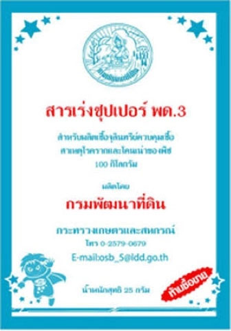 - เก็บสารเร่งซุปเปอร์ พด.3 ไว้ในที่แห้งและเย็น หลีกเลี่ยงแสงแดดโดยตรง
