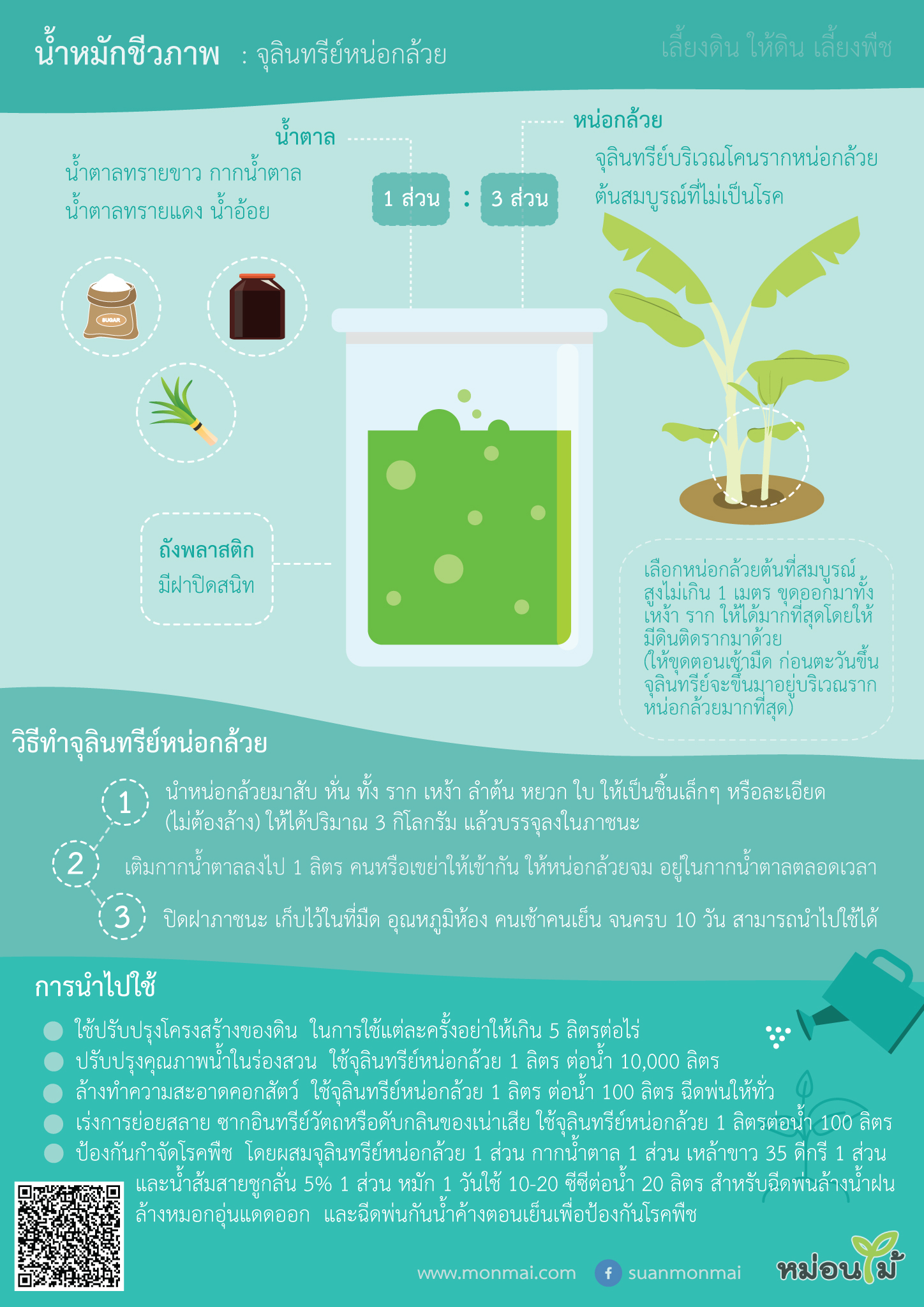 > บำรุงดิน: จุลินทรีย์หน่อกล้วย 20 ซีซี ต่อน้ำ 20 ลิตร ราดลงดิน