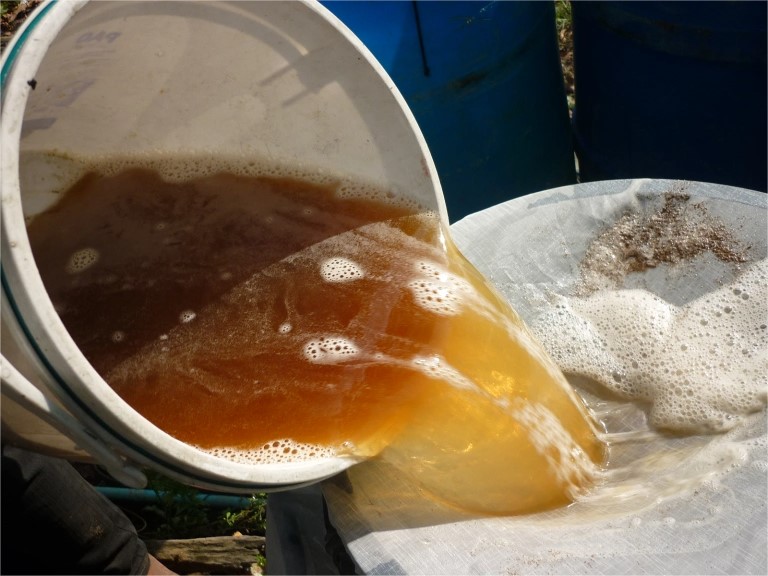 5. กรอง: กรองเอากากมูลสุกรออก จะได้นํ้าสกัดมูลสุกรที่มีลักษณะเป็นของเหลวสีน้ำตาล