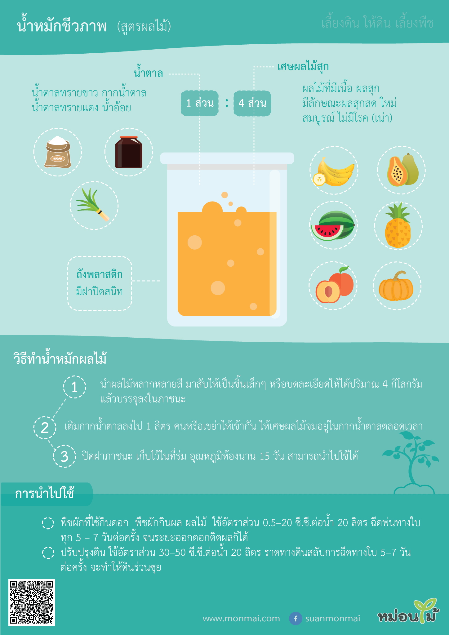- เร่งดอก ผล: น้ำหมัก 1 ส่วน ผสมกับน้ำสะอาด 5-10 ส่วน รดลงดินรอบโคนต้น ในช่วงก่อนออกดอกและติดผล ทุกๆ 7-10 วัน