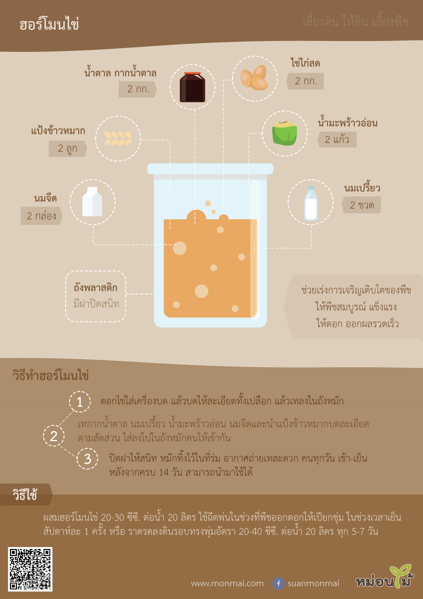 + สูตรแป้งข้าวหมาก: เติมแป้งข้าวหมากบดละเอียด ประมาณ 1 ลูกเล็ก จะช่วยเพิ่มเอนไซม์และจุลินทรีย์ในการย่อยสลาย