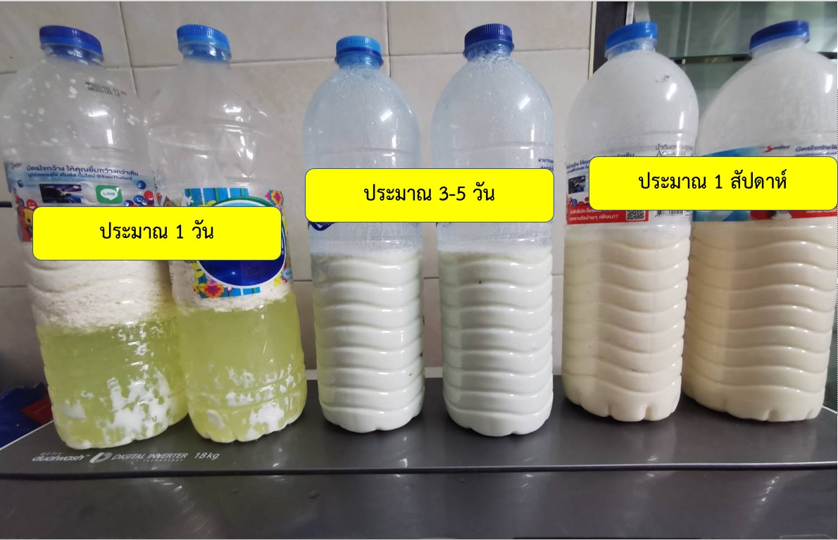 4. ตั้งทิ้งไว้: ปิดฝาขวดให้สนิท (แต่คลายเล็กน้อยเพื่อระบายแก๊ส) ตั้งทิ้งไว้ในที่ร่มอีกประมาณ 7-14 วัน สังเกตว่านมจะค่อยๆ จับตัวเป็นชั้นไขและมีน้ำใสสีเหลือง (เวย์) แยกออกมา