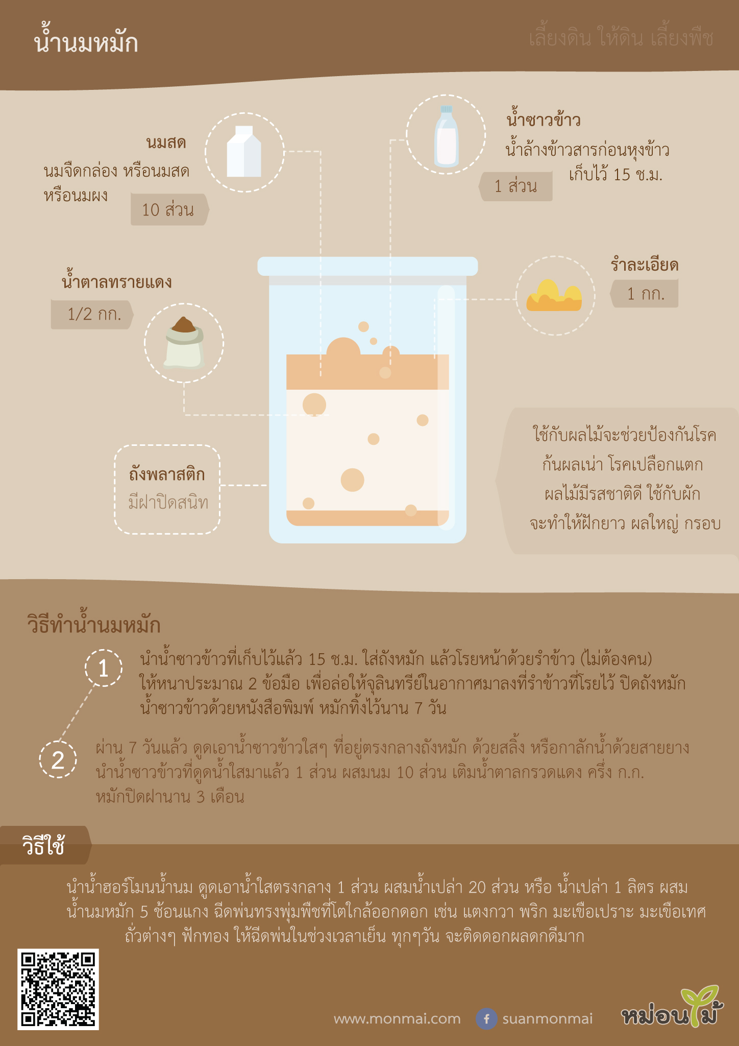 - บำรุงดิน: เจือจางน้ำหมักนมกับน้ำในอัตราส่วน 1:10 ถึง 1:20 ราดลงดินบริเวณรอบโคนต้น หรือผสมกับการให้น้ำ