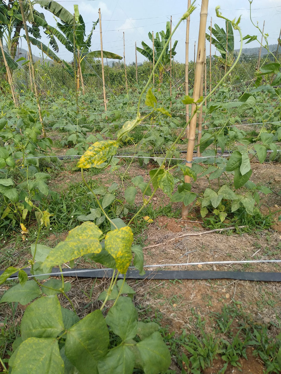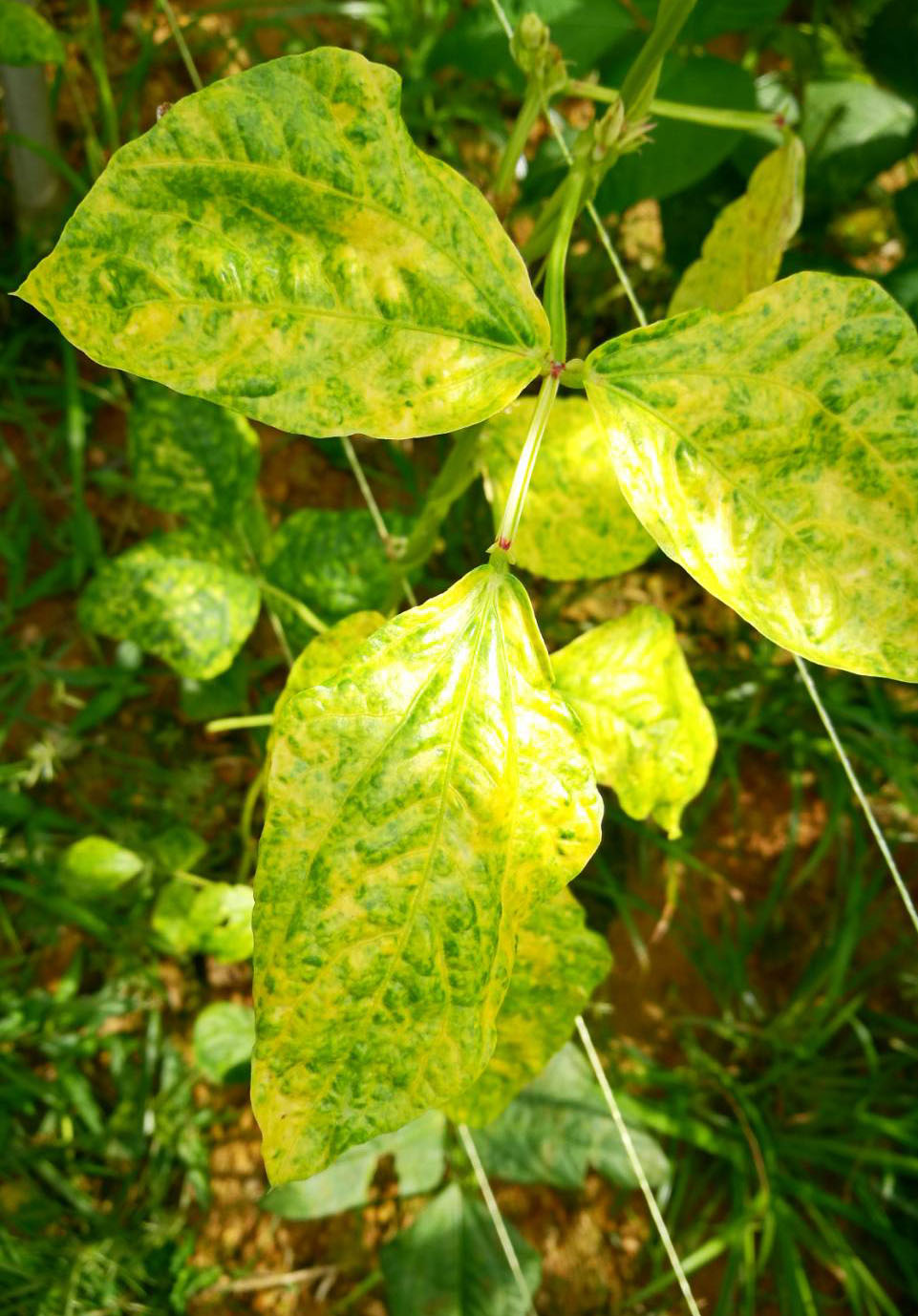 - โรคใบเหลืองในถั่ว (Mungbean Yellow Mosaic Virus, MYMV): เกิดจากเชื้อ Begomovirus มีแมลงหวี่ขาวเป็นพาหะ ทำให้ใบถั่วมีอาการเหลืองด่างเป็นปื้นๆ