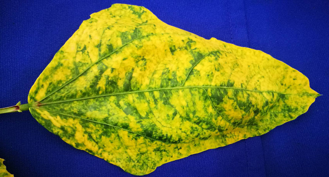 - โรคไวรัส: พืชที่เป็นโรคไวรัสหลายชนิดจะแสดงอาการใบเหลือง ด่าง หรือเป็นลายผิดปกติ