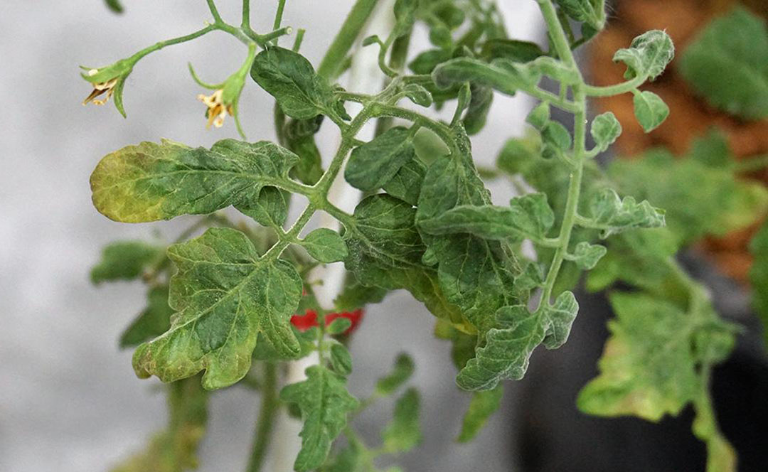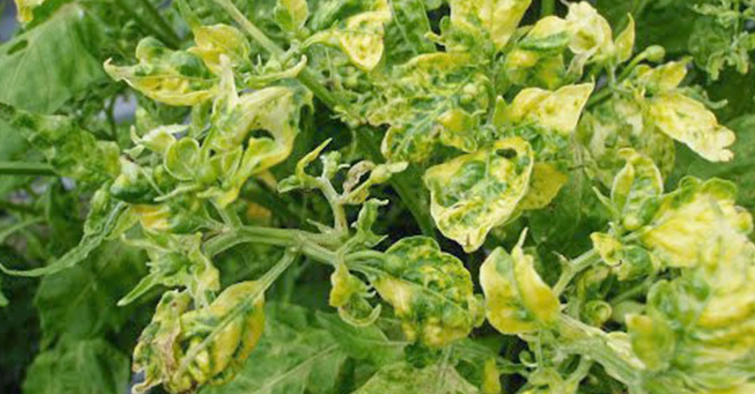 - อาการ: ใบพริกและมะเขือเทศจะหงิกงอ ม้วนงอขึ้นด้านบน เหลืองซีด เส้นใบเหลือง ยอดเป็นกระจุก ต้นแคระแกร็น ไม่ติดดอกออกผล หรือให้ผลผลิตน้อยและมีคุณภาพต่ำมาก