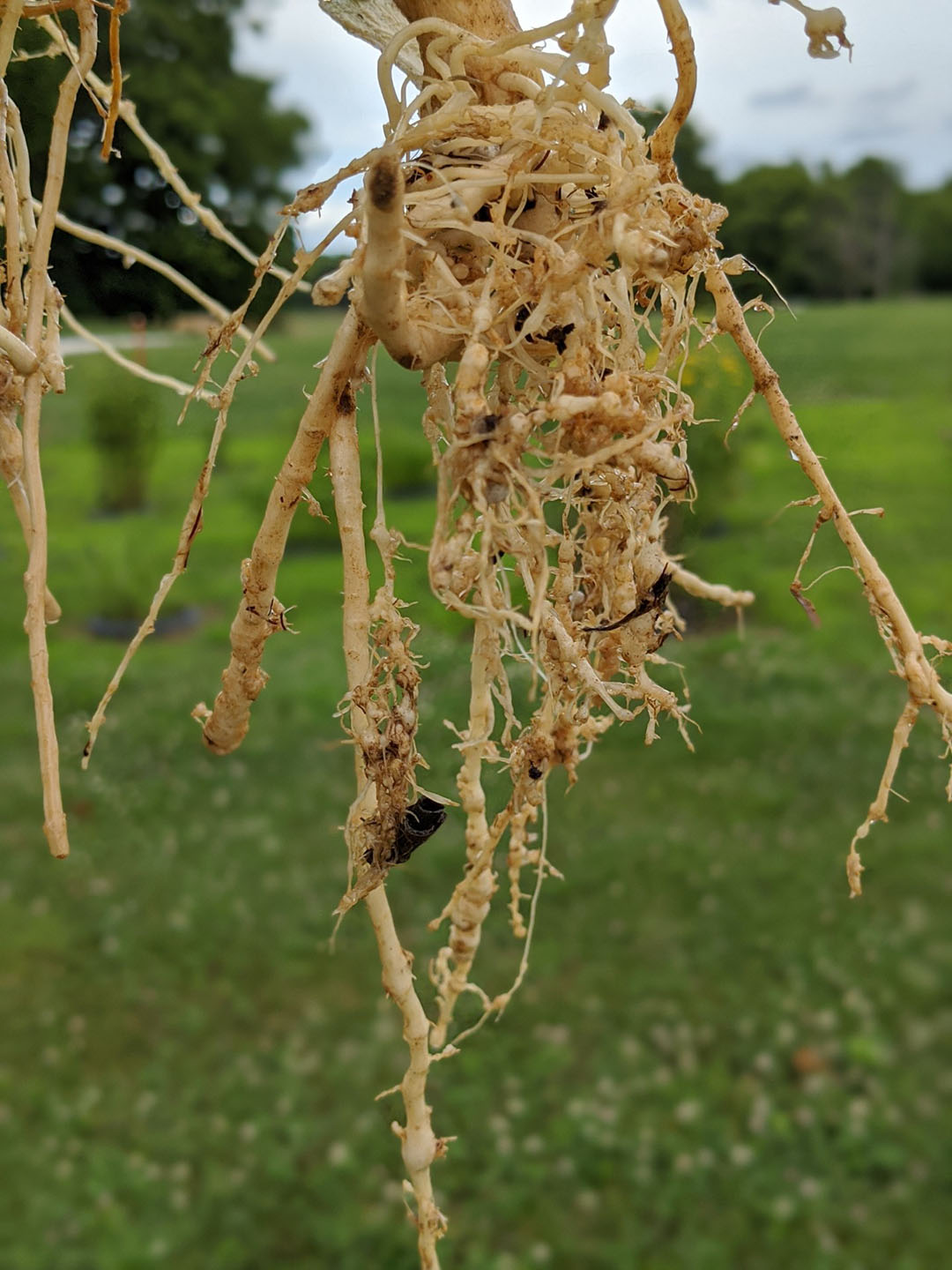 - เกิดปุ่มปม (Galls): เป็นลักษณะเด่นที่สุดของโรคนี้ เมื่อถอนต้นพืชขึ้นมาดูที่ราก จะพบว่ารากเกิดอาการบวมพองเป็นปุ่มปมขนาดต่างๆ กัน คล้ายเนื้องอก หรือปมถั่วที่พืชตระกูลถั่วมีตามธรรมชาติ (แต่ปมรากที่เกิดจากไส้เดือนฝอยจะบวมออกรอบด้าน ไม่ใช่ปมเป็นเม็ดๆ เหมือนพืชตระกูลถั่ว)