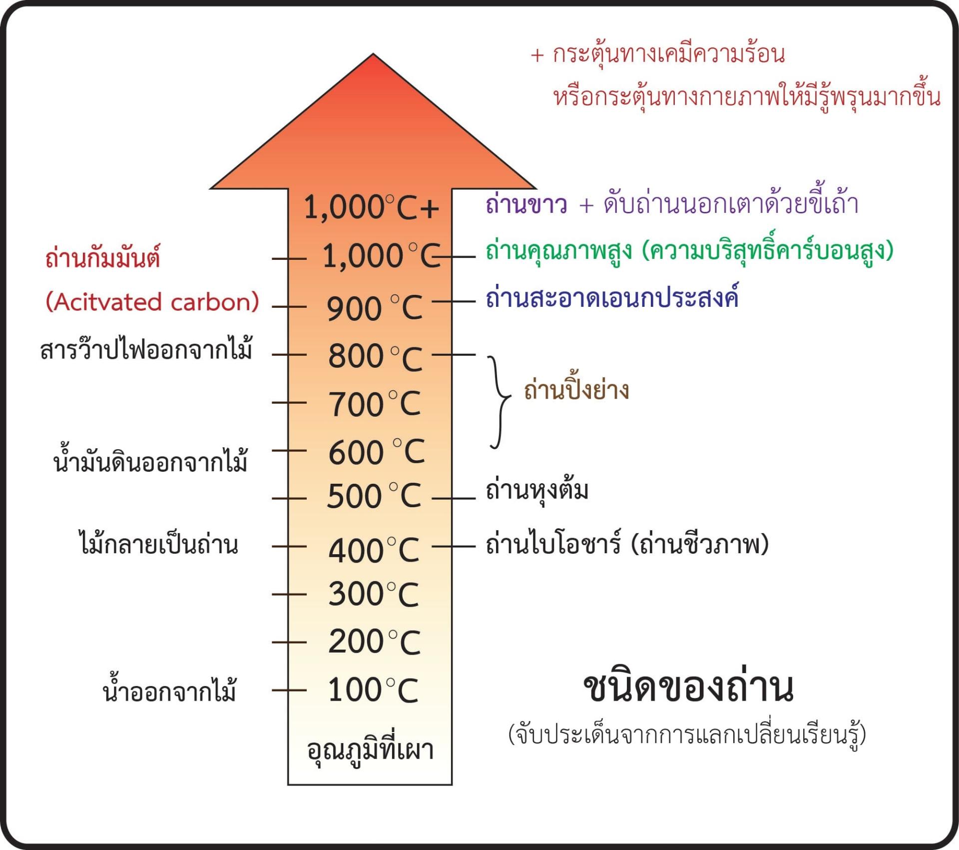 - การกลายเป็นถ่านสมบูรณ์ (Carbonization Phase): อุณหภูมิจะสูงขึ้นไปอีก (อาจถึง 400-700 °C) สารอินทรีย์ระเหยออกไปเกือบหมด เหลือแต่คาร์บอน (ถ่าน) ควันจะเริ่มบางลงและเปลี่ยนเป็นสีฟ้าอ่อนหรือโปร่งใส