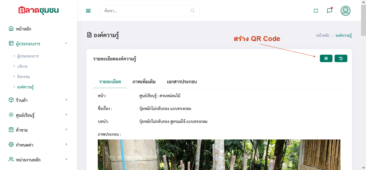 - ทำข้อมูลความรู้ ใส่รายละเอียดการให้ครบถ้วน แล้วทำการบันทึกข้อมูล แล้ว กดปุ่ม QR Code เพื่อสร้างภาพ QR Code ของความรู้ แล้วได้ภาพ QR Code ที่เชื่อมโยงไปสู่รายละเอียด แล้วนำ QR Code ใช้ในการออกแบบในสื่อต่างๆ เช่น ฉลากสินค้า เอกสารและนำและรายละเอียดสินค้า ป้าย แบนเนอร์ สื่อออนไลน์ต่างๆ เป็นต้น