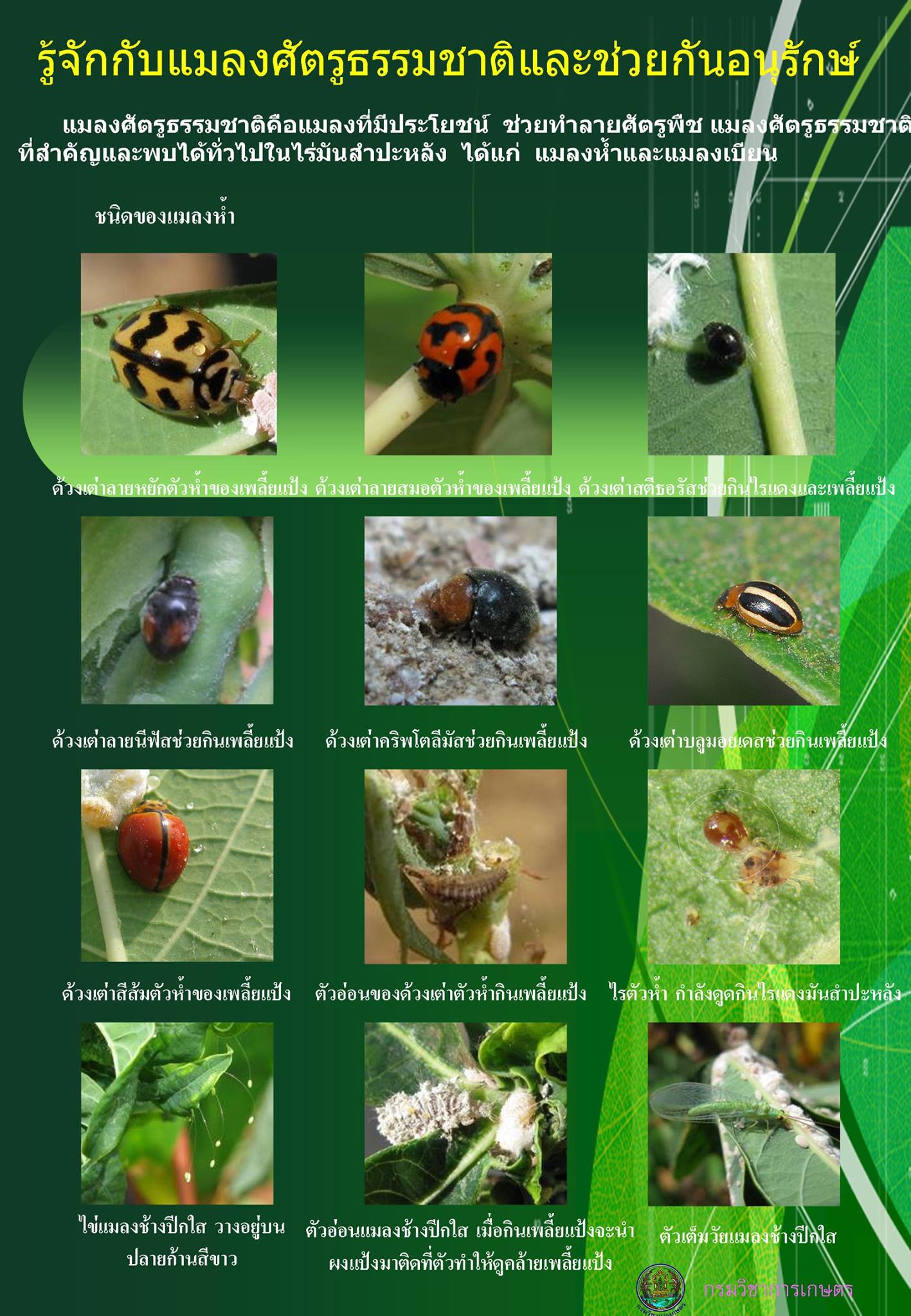 ด้วงเต่าตัวห้ำ: ทั้งตัวอ่อนและตัวเต็มวัยกินเพลี้ยอ่อน เพลี้ยแป้ง เพลี้ยหอย และไข่แมลงศัตรูพืช การอนุรักษ์หรือปล่อยเพิ่มจำนวนในแปลงสามารถช่วยลดการระบาดของศัตรูพืชเหล่านี้