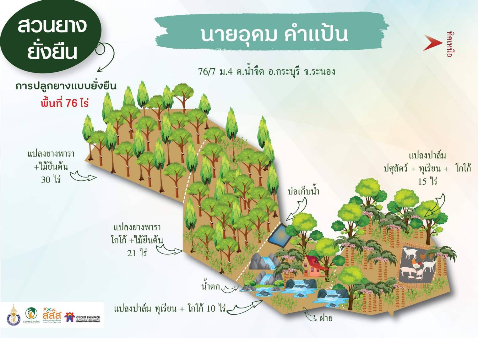 สวนยางยั่งยืนของนายอุดม คำแป้น คือพื้นที่เกษตรผสมผสานที่พัฒนาบนหลักคิด  ใช้ประโยชน์คุ้มค่า รักษาสมดุลธรรมชาติ  ครอบคลุมพื้นที่ทั้งหมด 100 ไร่ แบ่งเป็นแปลงเกษตรหลากหลายรูปแบบเพื่อกระจายความเสี่ยงและสร้างรายได้หลายทาง