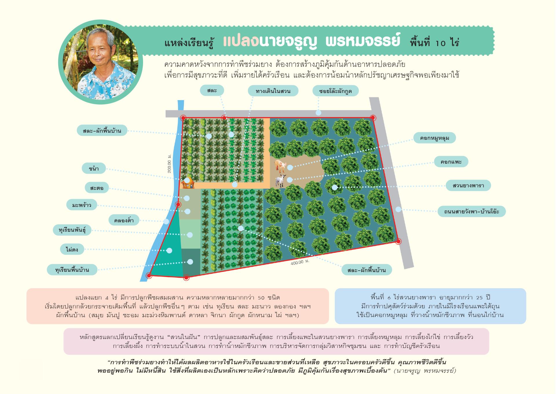 "การทำฟาร์มร่วมยาง ทำให้ได้ผลผลิตอาหารใช้ในครัวเรือนและขายส่วนที่เหลือ สุขภาวะในครอบครัวดีขึ้น คุณภาพชีวิตดีขึ้น พออยู่พอกิน ไม่มีหนี้สิน ใช้สิ่งแวดล้อมเป็นหลักเพราะคิดว่าปลอดภัย มีภูมิคุ้มกันเรื่องสุขภาพยั่งยืน" (นายจรูญ พรหมจรรย์)
