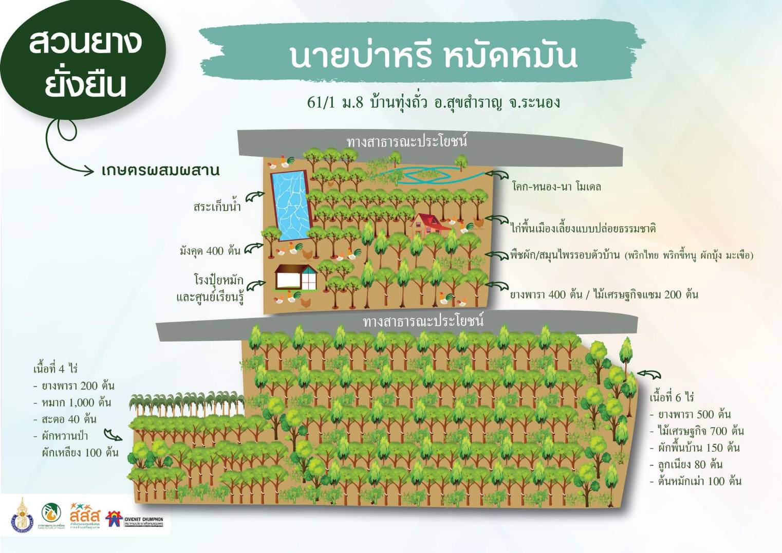 เนื้อที่ 6 ไร่ - ยางพารา 500 ต้น - ไม้เศรษฐกิจ 700 ต้น - ผักพื้นบ้าน 150 ต้น - ลูกเนื่อง 80 ต้น - ต้นหมากเม่า 100 ต้น