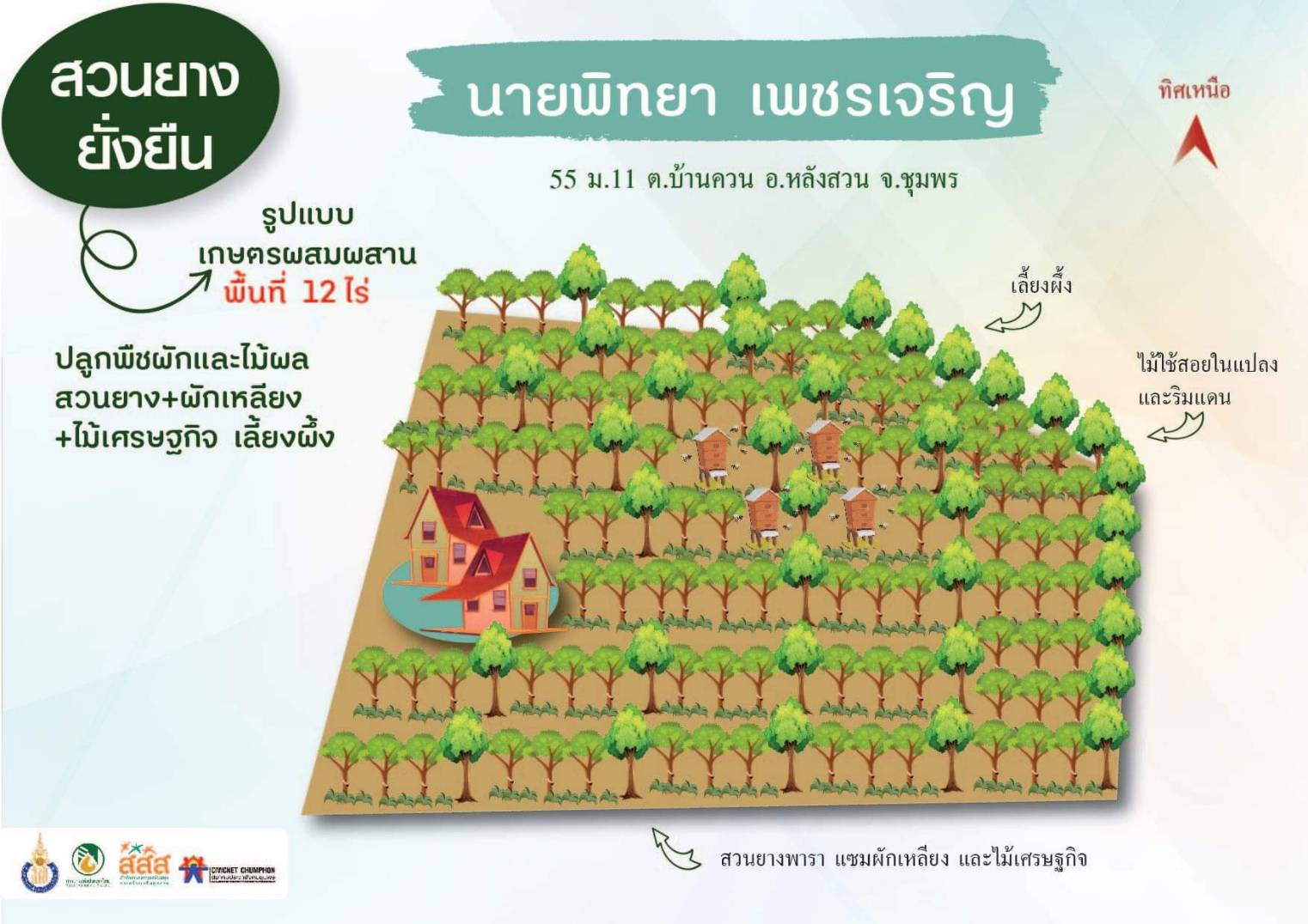 รูปแบบการทำพืชร่วมยางในสวนผสมผสาน ปรับจากสวนยางพาราเชิงเดี่ยวเป็นเกษตรผสมผสาน โดยจัดพื้นที่ยางพารา 10 ไร่ ได้ปลูกผักเหลียงและไม้เศรษฐกิจและ ไม้ใช้สอย ได้แก่ สะเดาเทียม และยางนา อายุกว่า 20-30 ปี จำนวน 50 ต้น ไม้พะยอม, มะฮ็อกกานี, ตะเคียนทอง , จำปาทอง, และไผ่ต่าง ๆ อายุกว่า 5 ปี จำนวน 900 ต้น ในส่วนพื้นที่ 2 ไร่ อาณาบริเวณบ้านนั้นปลูกไม้ผลและพืชผัก สมุนไพร ได้แก่ เงาะ, ลองกอง, มะม่วง, ชมพู่, กะท้อน ,กล้วยเล็บมือ,กล้วยน้ำว้า , ผักเหลียง, พริก, ผักหวาน,คะน้าเม็กซิโก พร้อมเลี้ยงผึ้ง และเลี้ยงปลาช่อน,ปลาดุก