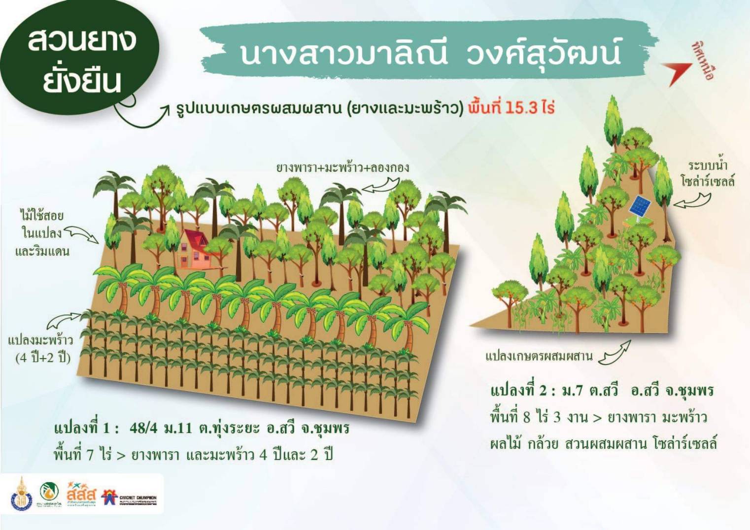 - แปลงมะพร้าวร่วมยางพารา หมู่ที่ 2 ต.สวี อ.สวี จ.ชุมพร จำนวน 8 ไร่ 3 งาน ยางพารา 400 ต้น แซมด้วย มะพร้าว 200 ต้น และผักเหลียง ลองกอง มังคุด ขนุน