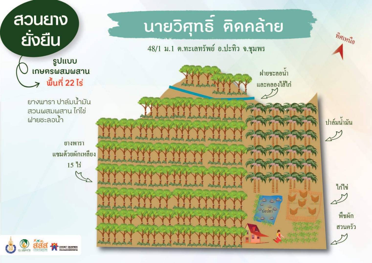 สวนเกษตรผสมผสานของนายวิศุทธิ์  ติดคล้าย มีการจัดการรูปแบบ “ระบบนิเวศพืชร่วมยาง” จำนวนพื้นที่ 22 ไร่ มีการจัดการพื้นที่ทางการเกษตรที่หลากหลาย ดังนี้